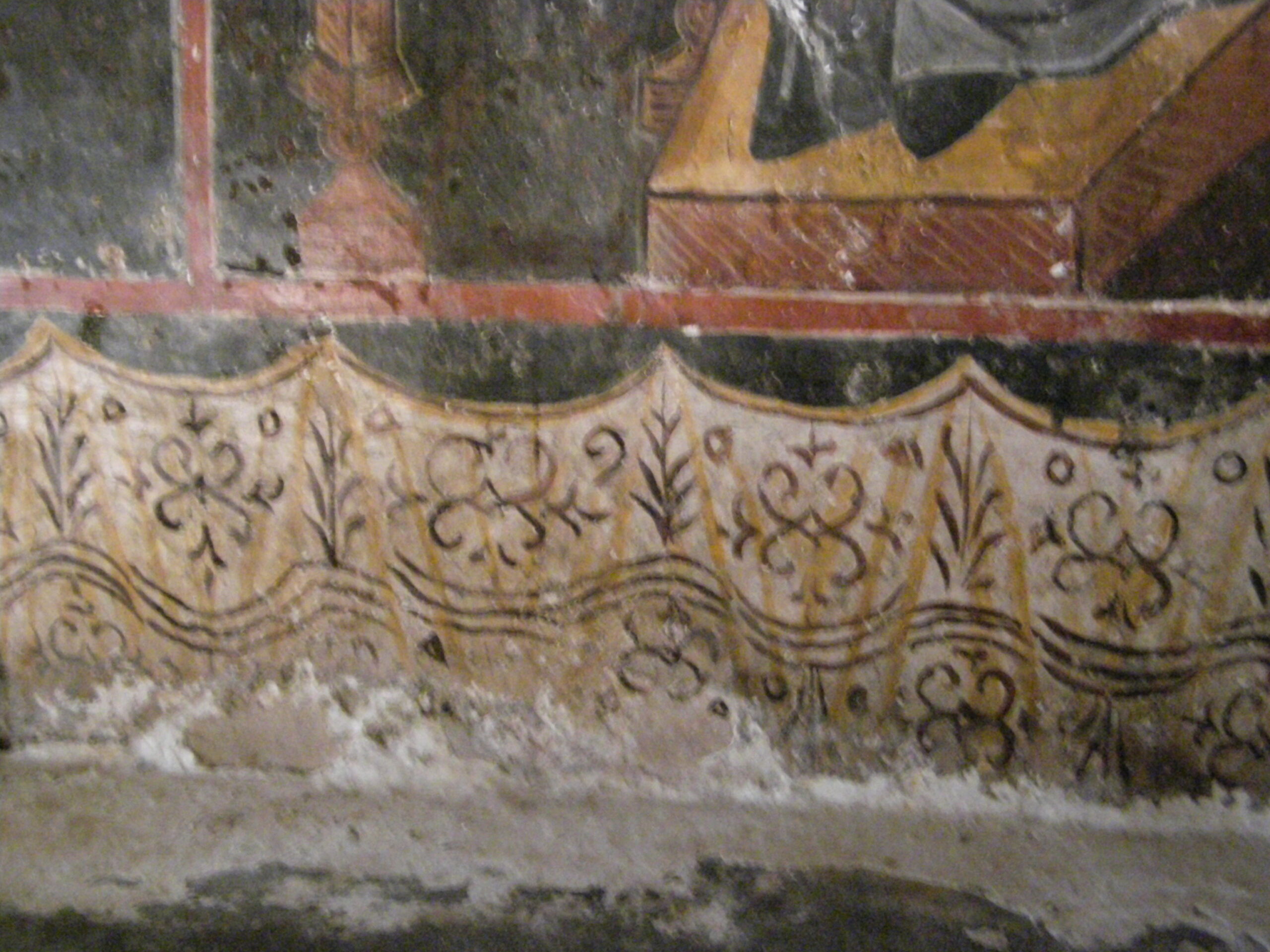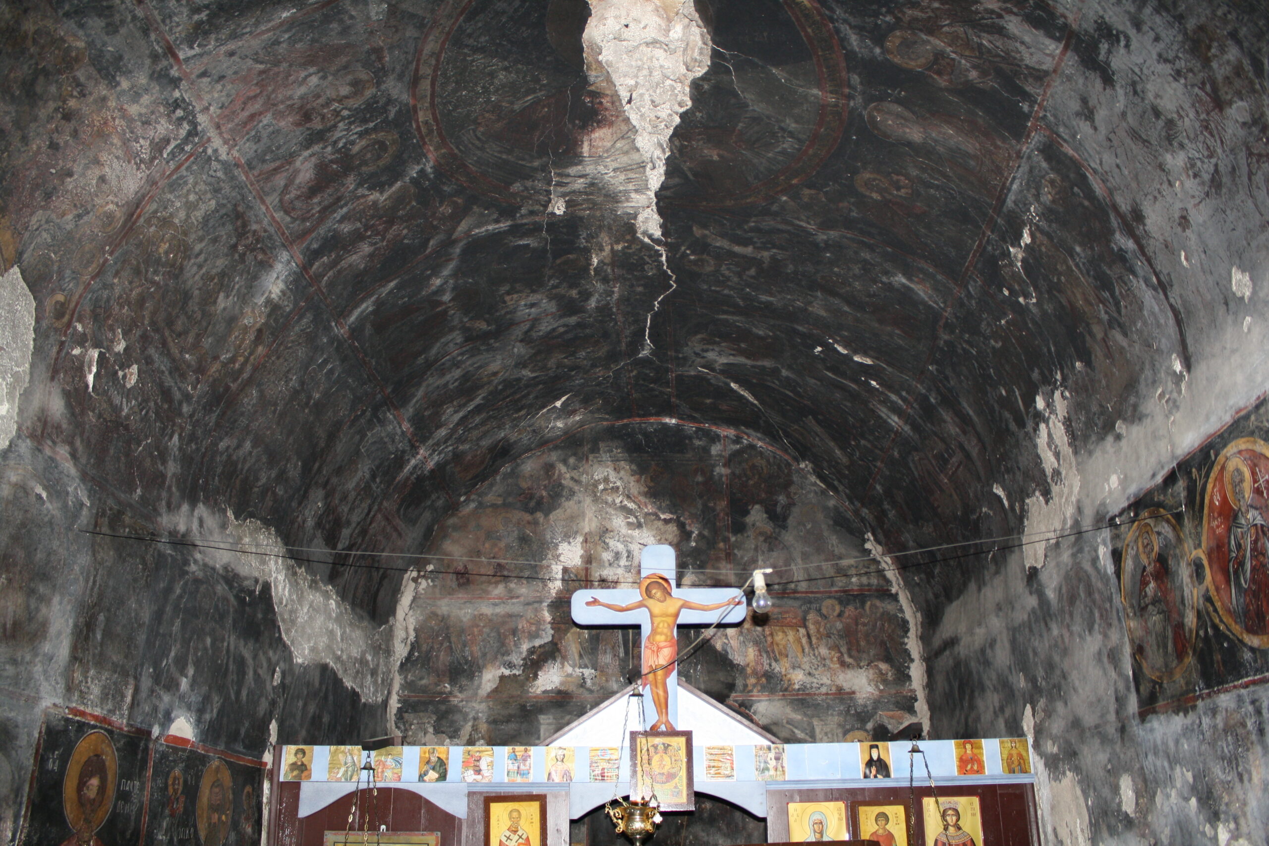 Η διαστάσεις του ναού είναι 3,15×6,45 (χωρίς την κόγχη του ιερού)στεγάζεται με καμάρα και είναι κατάγραφος. Η χαμηλή πόρτα ανοίγεται στο δυτικό τοίχο, ενώ παράθυρα δεν υπάρχουν. Οι τοιχογραφίες παρουσιάζονται κατά ζώνες· στον κυρίως ναό τρεις ζώνες σε κάθε τοίχο, η χαμηλότερη μεγαλύτερη σε πλάτος, και στην καμάρα δύο, οι οποίες χωρίζονται με κάθετες γραμμές σχηματίζοντας τετράγωνα, ένα για κάθε μορφή αγίου. Εξαίρεση αποτελεί ο δυτικός τοίχος όπου η κρίση των δικαίων και αδίκων εκτυλίσσεται ελεύθερα. Στο Ιερό που χωρίζεται σήμερα από τον κυρίως ναό με ταπεινό ξύλινο τέμπλο, ανάμεσα στην κόγχη και το τυφλό άνοιγμα της πρόθεσης πάνω από τον Αγ. Στέφανο, υπάρχει δεύτερη επιγραφή δυσανάγνωστη. Το μόνο βέβαιο είναι ότι μνημονεύονται ονόματα μοναχών που φαίνεται πως συνέβαλαν επίσης στην εικονογράφηση. Αν ληφθεί υπόψη ότι υπάρχουν και άλλα δυσανάγνωστα ονόματα, ο αριθμός των μοναχών ανέρχεται περίπου σε δέκα. Αν θεωρηθούν όλοι σύγχρονοι, φαίνεται πως η μονή ήταν αρκετά ανθηρή.