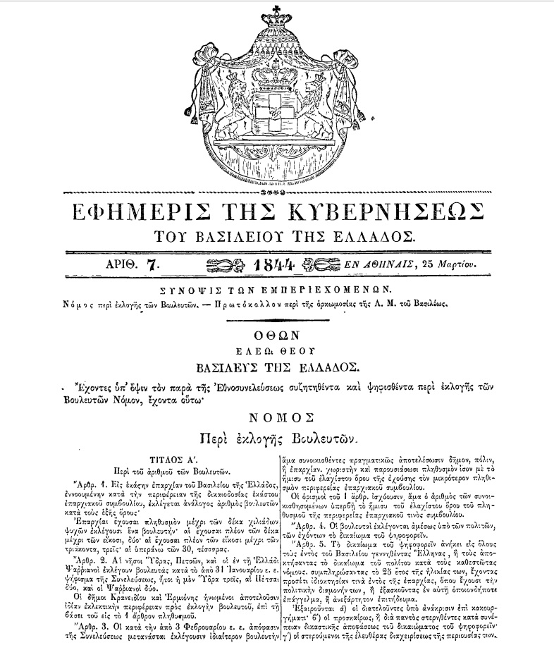 Σύµφωνα µε το Σύνταγµα του 1844, οι βουλευτικές εκλογές διεξάγονταν σ’ όλην την Επικράτεια κάθε τρία χρόνια. Η ψηφοφορία διεξαγόταν στην έδρα του Δήµου από πενταµελή Εφορευτική Επιτροπή, τα µέλη της οποίας εξάγονταν µε κλήρο από κατάλογο που περιελάµβανε άτοµα που είχαν χρηµατίσει Δήµαρχοι, Πάρεδροι, Δηµοτικοί Σύµβουλοι ή ορκωτοί. Πρόεδρος της Επιτροπής ήταν το πρώτο κληρωθέν µέλος της (άρθρο 18 του από 18.3.1844 Νόµου περί εκλογής βουλευτών Ι).